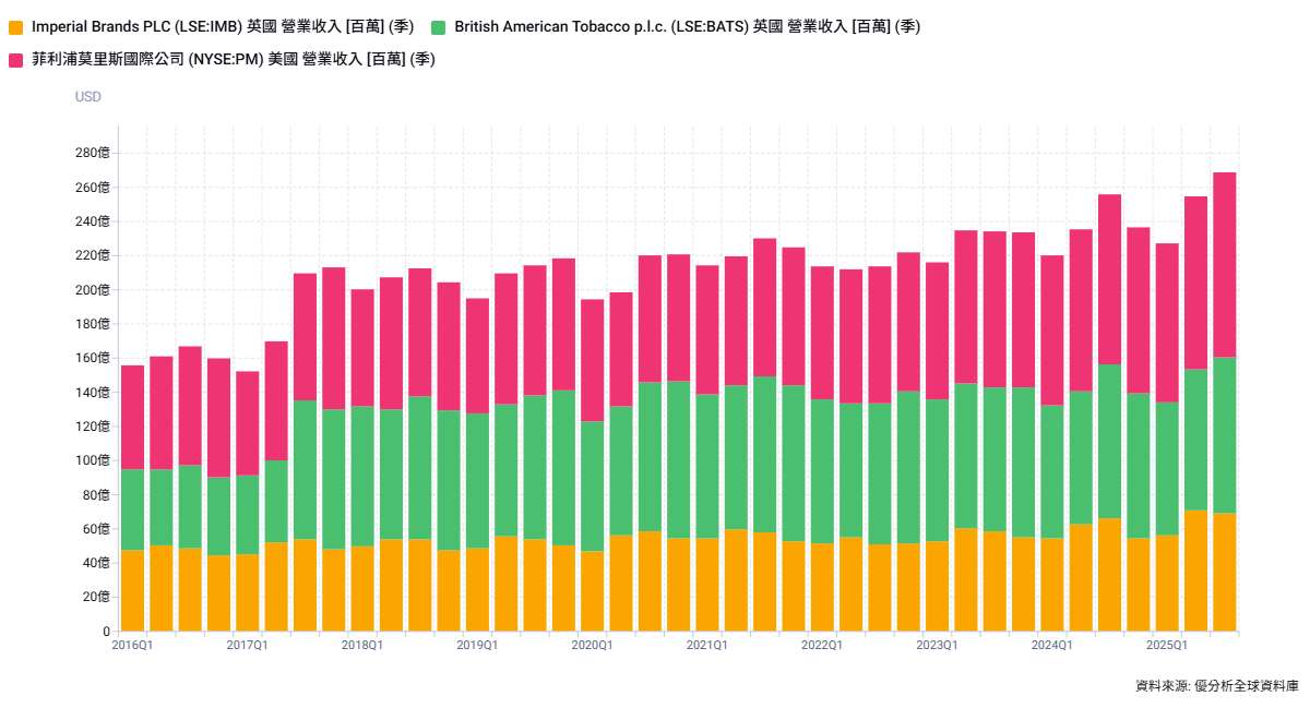 相較於英美菸草British American Tobacco(BATS-LN)與菲利普莫里斯Philip Morris International(PM-US)較著重高階品牌與新型產品研發,Imperial Brands過去更偏向價格競爭策略;而在傳統紙菸需求持續下滑的環境下,公司目前也正轉向優化獲利結構,試圖在銷量承壓之際維持獲利表現。