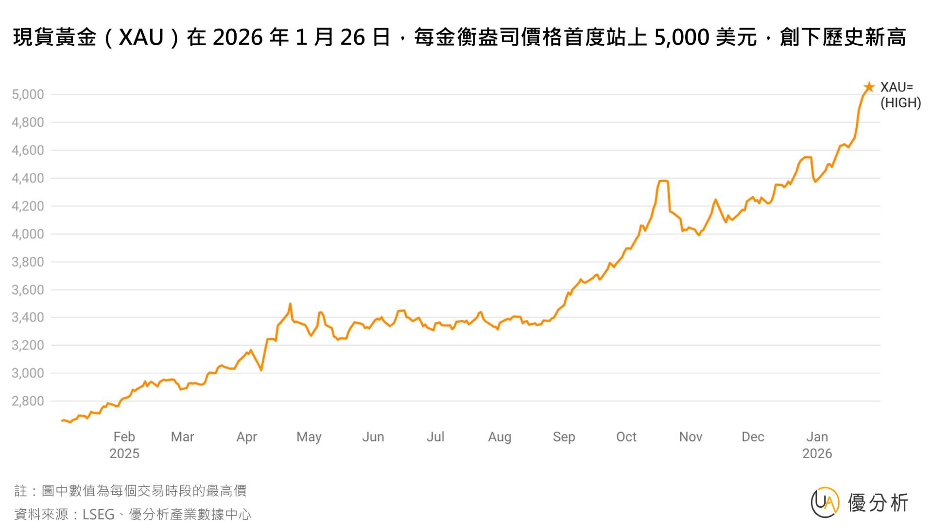 2026年01月26日(優分析/產業數據中心報導)⸺ 隨著全球地緣政治風險加劇,黃金價格於本週一正式突破每盎司 $5,000 美元關卡,創下歷史新高,成為市場上資金湧入的主要避風港。