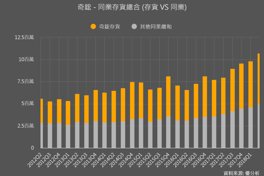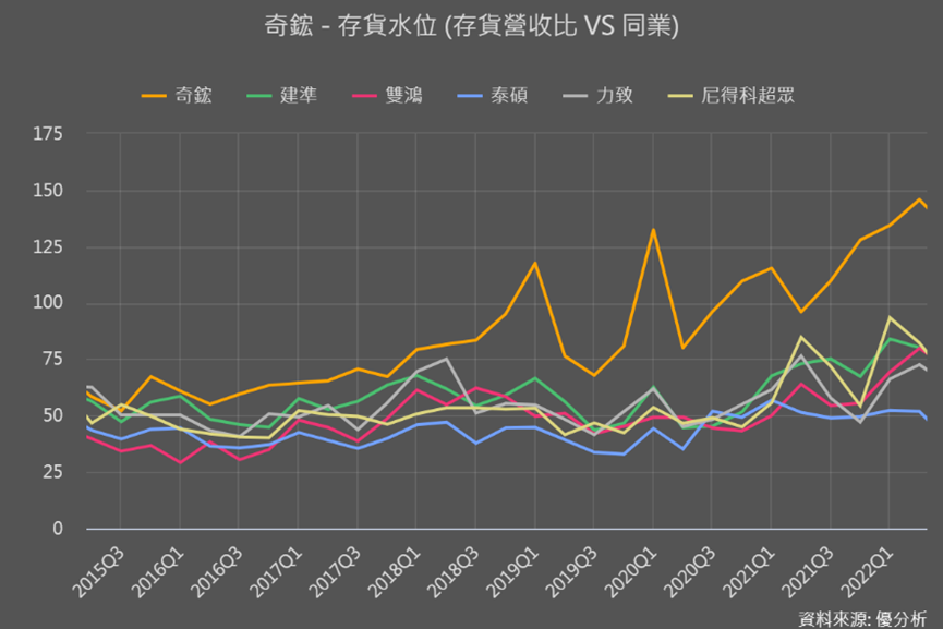 下圖奇鋐的存銷比132%比同業都高出不少,表示存貨高於銷售量,即使庫存總金額降下來了,但存銷比仍在歷史相對高的水位,相對同業來說存貨健康程度比較不好嗎?我們先來看它的情況。