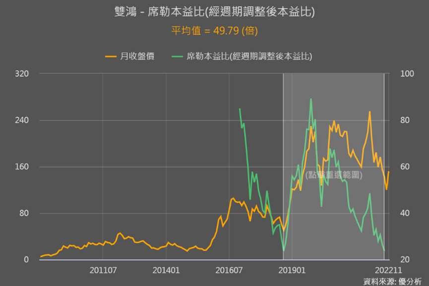 不過雙鴻的席勒本益比已掉到歷史低點的位置、為23.7倍,距離平均值有110%的回升空間。所以雙鴻的首波行情是評價回升,後續要再追蹤營收能不能回溫,若營收持續衰退就要注意反彈後續上漲空間有限。