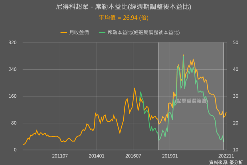 奇鋐Q3存貨金額下降了,隨著月營收持續創新高,存貨銷售比(綠線)也跟著下降,但存銷比132%仍維持相對高的水位,部分原因是產品應用在成長性比較高的伺服器產業,所以之前備貨原就較同業來的更為積極。再對比席勒本益比,若在相對歷史低點,那奇鋐未來反彈力道仍然可以期待。