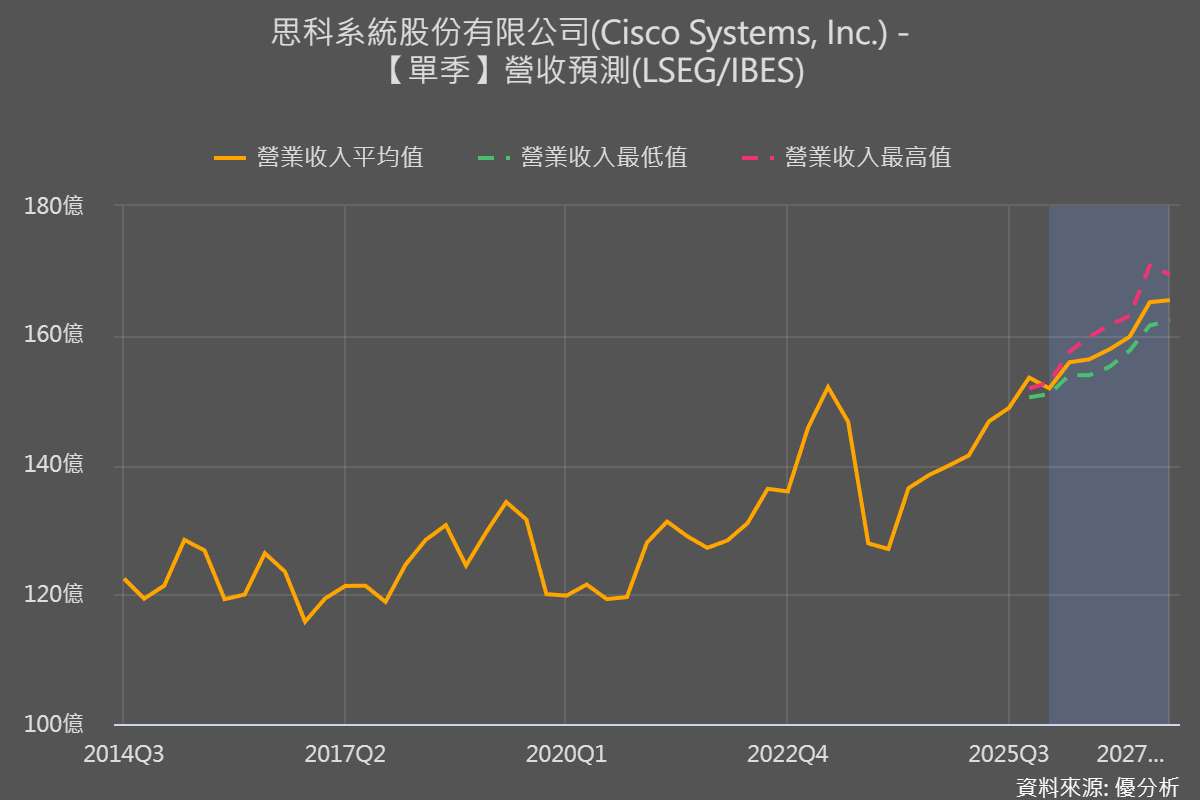 FY2026 Q2 已出貨第 100 萬顆 Silicon One,400G 與 800G 光模組同步放量,代表在高階網路矽晶與光學層面已站穩位置。同時,公司透過整合 Splunk 強化安全與資料平台能力,將網路、可觀測性與安全功能整合為一體。