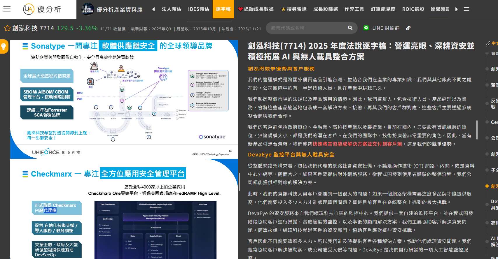 2025年11月24日(優分析/產業數據中心報導)⸺ 創泓科技(7714-TW)董事長黃健寧表示,2024 年公司在資安、AI 與無人載具三大領域同步布局,已見具體成果,2025年前三季EPS達4.34元,截至今年10月更是達到5.12元,全年營運動能可望優於去年。