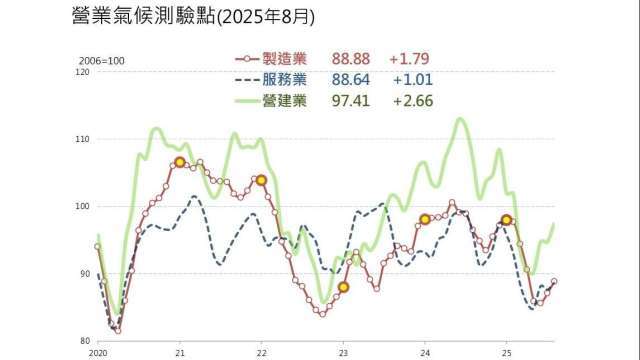 台灣經濟研究院今 (25) 日公布 9 月景氣動向調查,製造業營業氣候測驗點為 88.88 點,月增 1.79 點,連 2 月上揚,服務業為 88.64 點,月增 1.01 點。