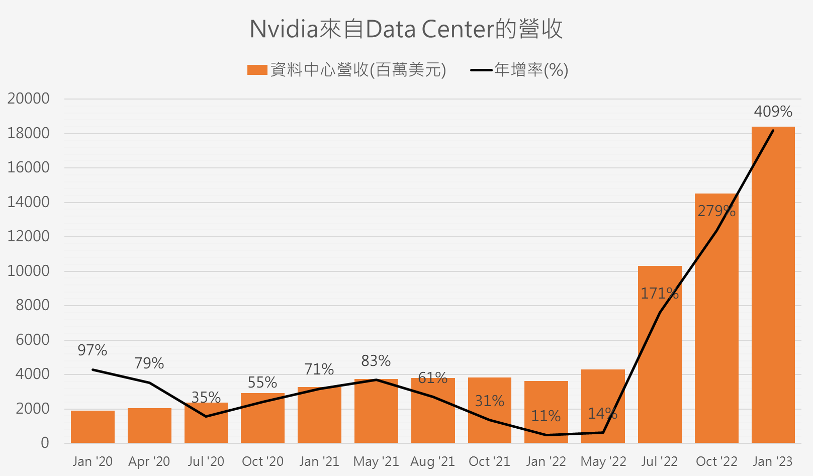 Data Center(資料中心)是Nvidia最大營收部門,在上一季(財年Q4)的收入增長了409%,達到184億美元,高於LSEG數據的168億美元的預期。