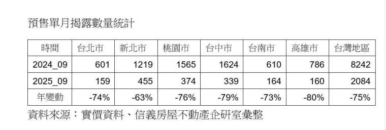 統計顯示,9 月預售單月揭露約 2084 件,是統計以來近 57 個月的新低紀錄,年減幅度約 75%,台北市 9 月預售揭露 159 件,年減 74%,新北市相對穩健,9 月揭露 455 件,年減 63%,桃園市 374 件年減 76%,台中市 339 件年減 79%,台南市 164 件年減 73%,高雄市 160 件年減 8 成。