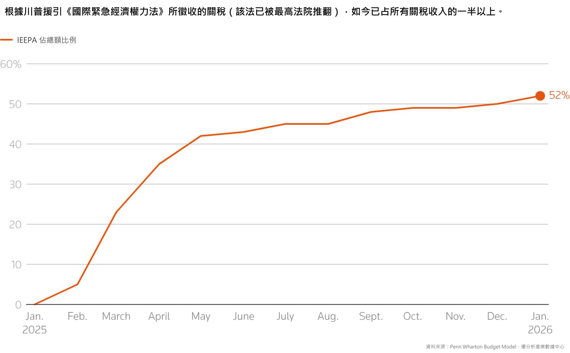 上圖呈現的是 IEEPA 相關關稅收入,占整體關稅收入的比重。從 2025 年初一路上升至 2026 年 1 月的 52%。