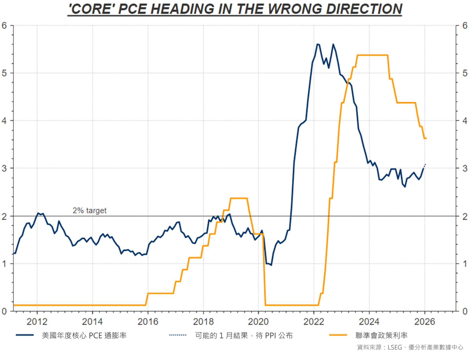 而現在的情況正是如此——核心 PCE 回到 3% 附近,代表通膨正在侵蝕原本的緊縮力道。