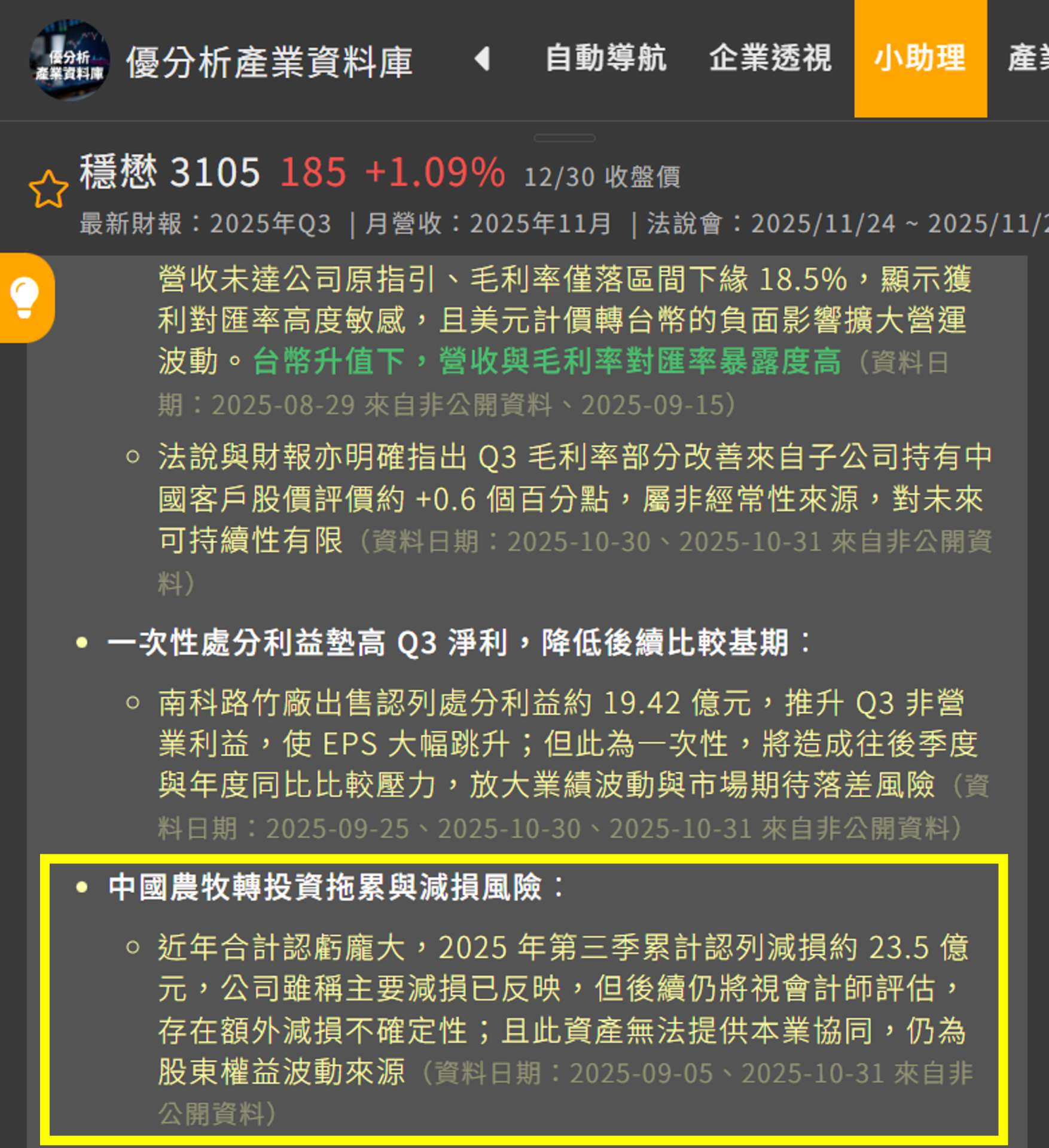 「你無法想像,以前穩懋在中國養豬,一年要賠掉EPS 3塊錢!」莊正賢指出,董事長陳進財後來展現魄力,果斷將養豬事業收起來。這個動作對財報的意義重大:「這3塊錢不賠了,就直接變成了現在的獲利。」