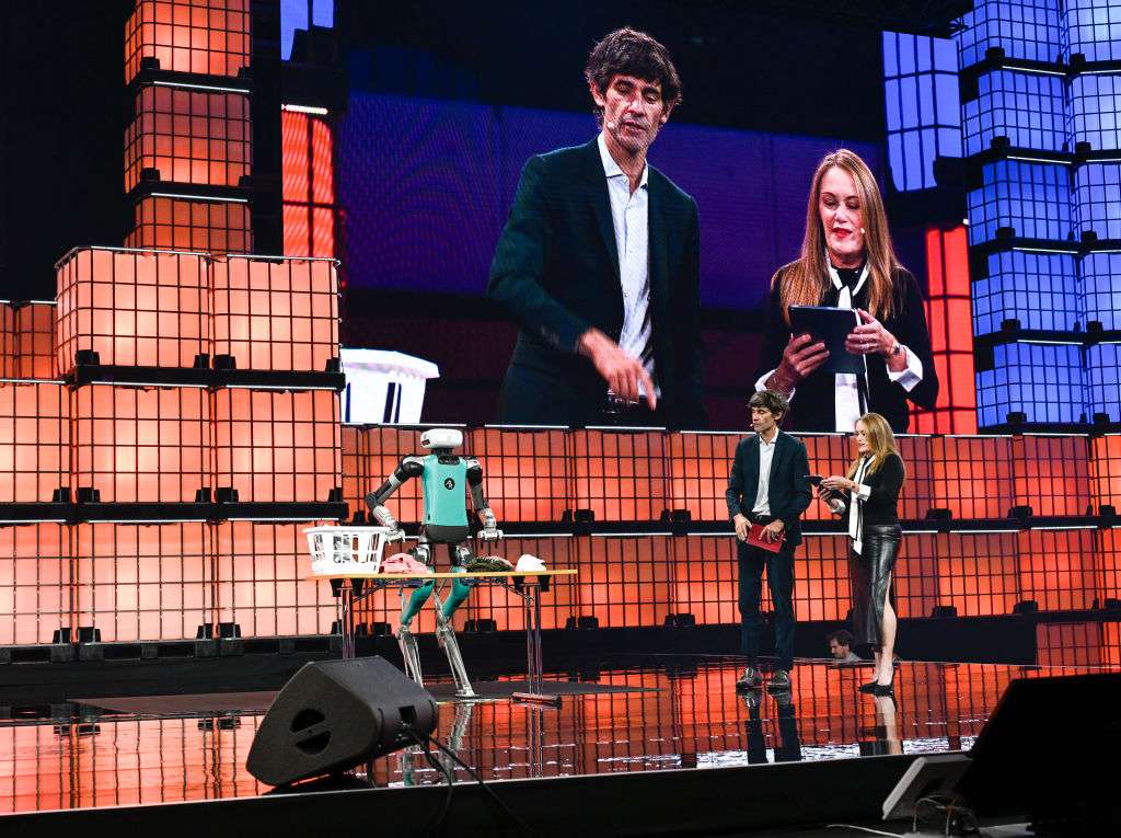 照片說明:2024年11月13日,Agility Robotics執行長Peggy Johnson(左)與《The Atlantic》執行長Nicholas Thompson對談時,展示重量72公斤、高1.75公尺的雙足機器人「Digit」,機器人正在舞台上搬運衣物。