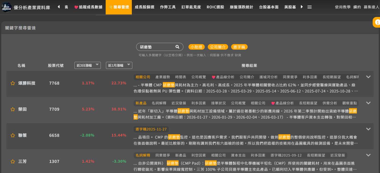 隨國際龍頭率先擴產,CMP研磨墊產業景氣可望延續成長動能。對台廠而言,若能在技術能力、產品完整度與客戶驗證上持續突破,未來在全球供應鏈重組過程中,仍具備提升市占的潛在空間。