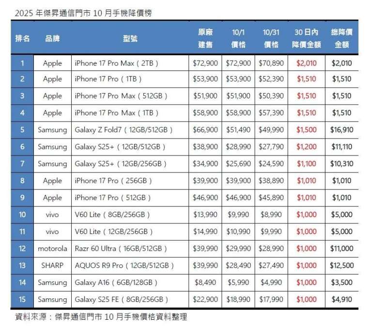 傑昇通信表示,新一代 iPhone 17 系列不僅開賣當月就進熱銷榜,價格也出現明顯變動。上市甫滿月即有 6 款新機進榜,成為 10 月降價榜最大贏家,降幅最為顯著的 iPhone 17 Pro Max(2TB)更是以月降 2,010 元奪得月降價冠軍。