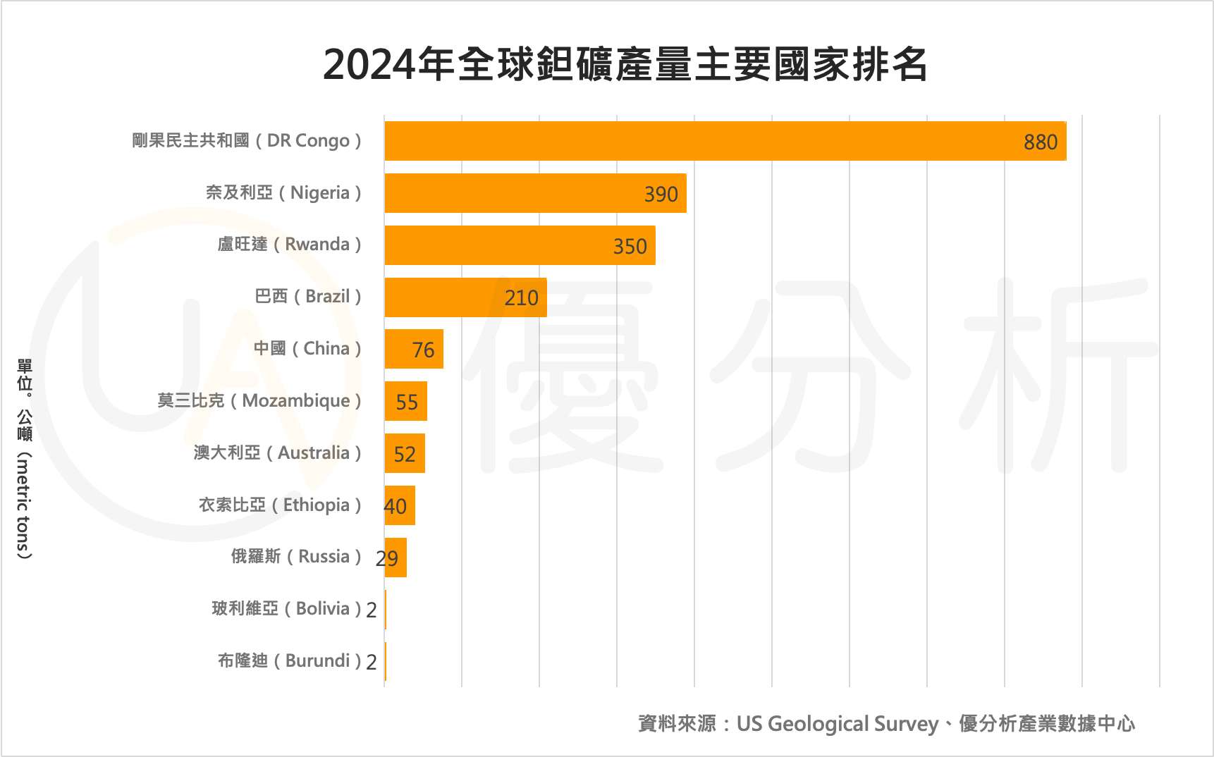 截至2024年,剛果民主共和國(Democratic Republic of the Congo, DRC)為全球最大的鉭生產國,全年產量估計達 880公噸,穩居全球首位。該國擁有豐富的鈮鉭鐵礦(coltan)資源,約佔全球總供應量近半,是全球電子級鉭原料的重要來源。