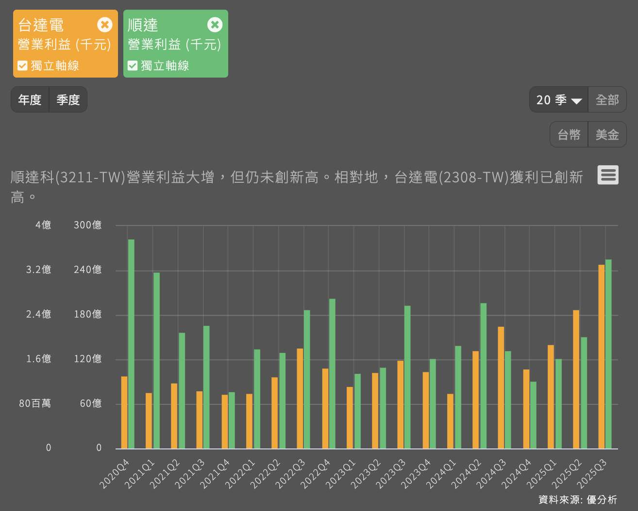 根據公司公告,雖然第三季營收僅年增0.87%,但毛利率16.14%,較去年同期10.73%顯著提升5.4個百分點,營業利益更成長近九成。累計前三季營業利益與稅後淨利均優於去年同期,顯示順達在產品組合與成本結構調整後,獲利彈性明顯提升。