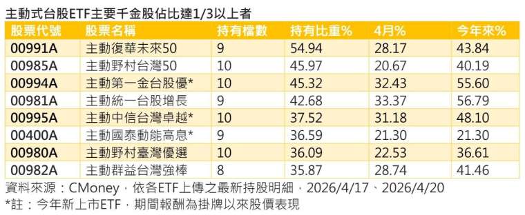 進一步觀察 8 檔持有市值前十大千金股占比最高的主動式台股 ETF,今年以來表現領先前三名分別為主動統一台股增長 (00981A-TW) 漲 56.79%、主動第一金台股優 (00994A-TW) 漲 55.60%,及主動中信台灣卓越 (00995A-TW) 漲 48.10% 等;而持有千金股占比最高的前三名則為主動復華未來 50(00991A-TW) 持有 54.94%、主動野村台灣 50(00985A-TW) 持有 45.97%、及主動第一金台股優 (00994A-TW) 持有 45.32% 等。