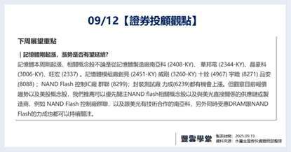 上週的【證券投顧觀點】文章中,在展望重點部分提到記憶體產業的漲勢,並建議投資者優先關注 NAND Flash 相關概念股,以及與美光有直接關聯的供應鏈或製造商,作為投資布局的參考方向... 軍工航太展概念股一次看!記憶體這週會大漲?台積電重要日期在這幾天!【證券投顧觀點】|豐雲學堂 2025 年 09 月 (sinotrade.com.tw)