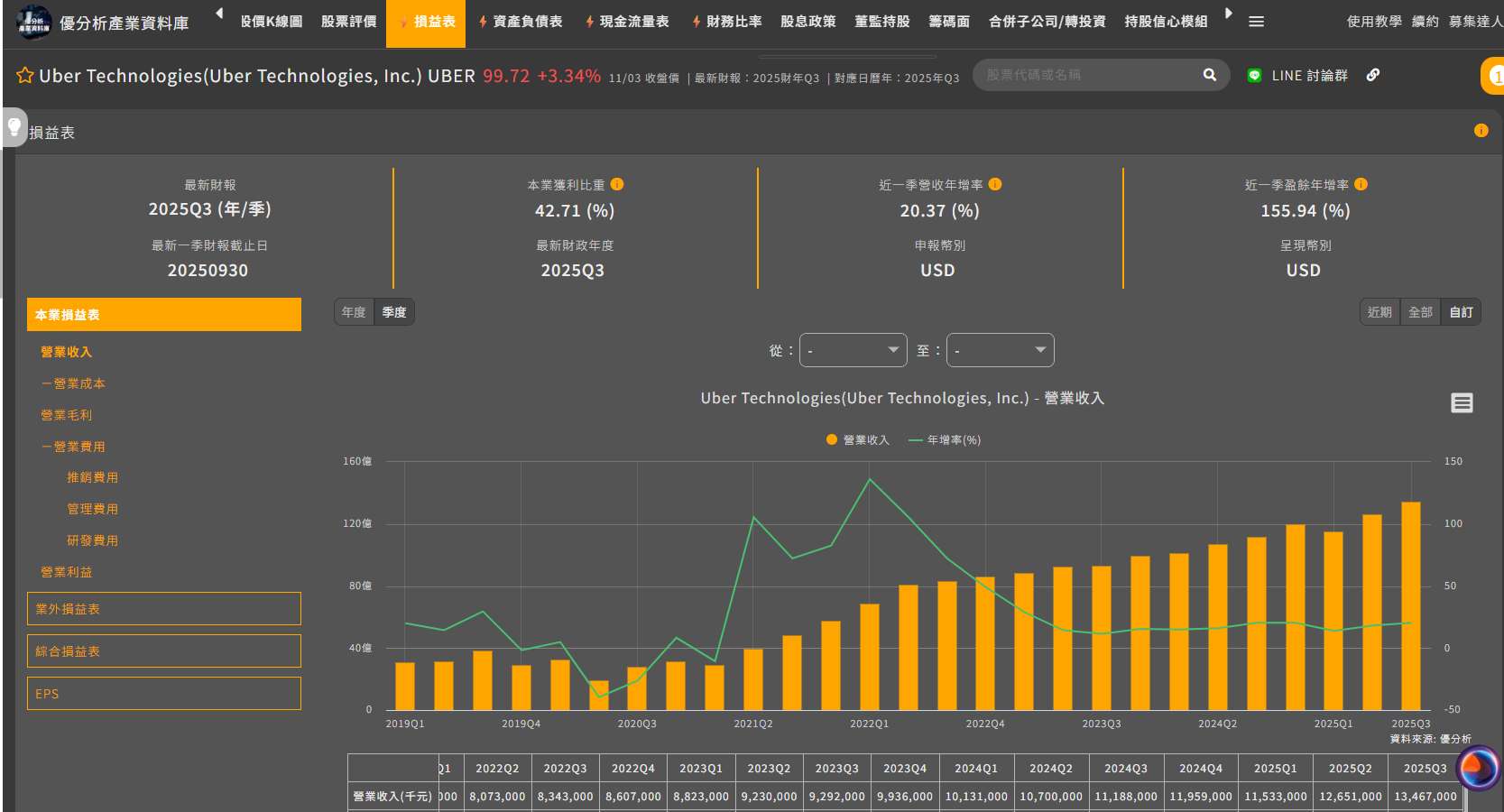2025年11月04日(優分析/產業數據中心報導)⸺ 共乘與外送平台Uber Technologies(UBER-US)週二公布第三季財報,營運獲利不如市場預期,主要受法律與監管支出影響。公司同時對第四季獲利展望偏保守,掩蓋了旗下外送與叫車業務的強勁需求,股價在盤前交易中重挫近9%。