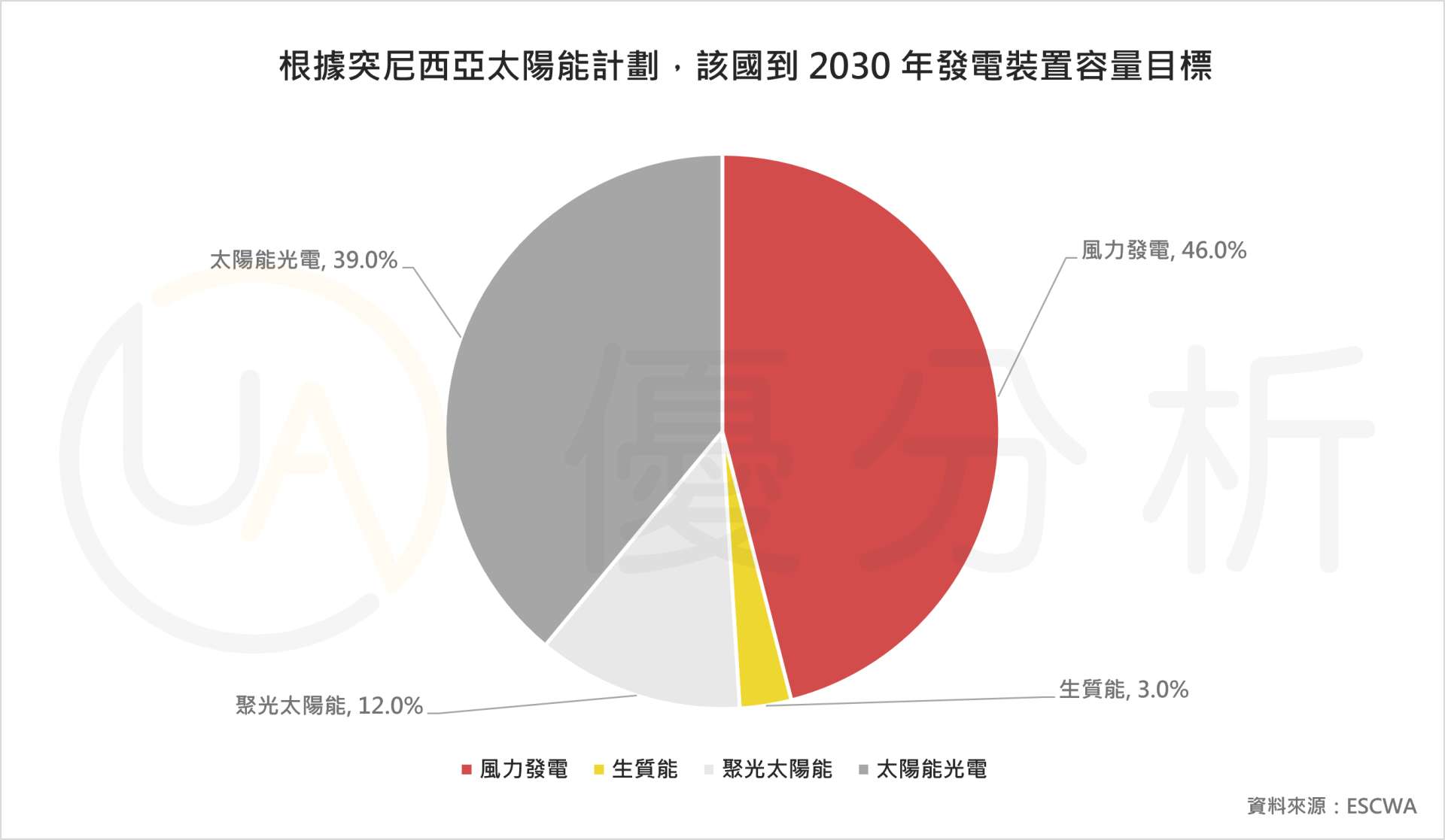 ※此圖表展示了突尼西亞根據《2030能源計劃》設置的再生能源發電裝置容量目標,詳細說明太陽能光電、風力發電、生質能與聚光太陽能的佔比。該目標體現了突尼西亞對多元化能源結構及推動綠色發展的承諾,並為能源轉型奠定基礎。