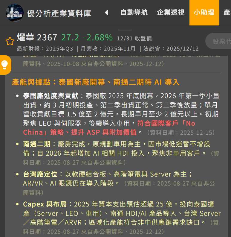 燿華(2367-TW): 泰國廠新產能加入,預計將有 25% 營收來自衛星板,獲利能力有望重回高峰。