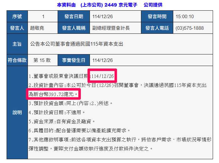 不看不知道,一看才發現,京元電也在上週五公告2026年創新高的393億資本支出。