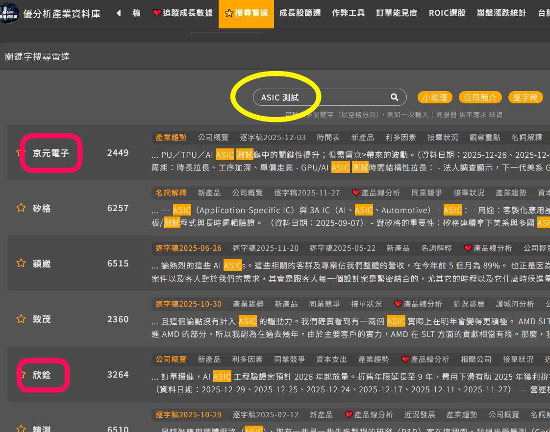 - 如果研究的過程中有發現某些關鍵字,也可以運用【搜尋雷達】進行查找,看看是否有受惠同樣『結構性趨勢』的公司,透過分析同類型公司,你可以把這股趨勢看的更清楚。