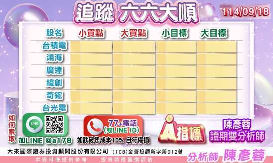 大來投顧陳彥蓉表示,美股在 Fed 宣布降息 1 碼,年底前有望再降,顯示資金行情啟動,多頭延續將有再創高機會;台股受 GB 伺服器進入大量量產期,且降息資金有助非 AI 族群復甦及國安基金不退場等,眾利多因素有望續旺台股再創高機會。只是短線不追高,權值股震盪將挹注中小型股補漲機會,盡速汰弱留強,積極跟上搶錢行情!