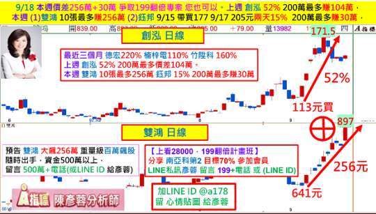 賀本欄預告的 竹陞科 (6739-TW) ,德宏(5475-TW),楠梓電(2316-TW),國精化(4722-TW),雷虎(8033-TW),攸泰(6928-TW),金居(8358-TW),南電(8046-TW) 全部兩個月翻倍 100%。本欄預告 台達電(2308-TW),九天大漲 188 元,雙鴻(3324-TW) 九天大漲 256 元! 想要領先於 每天早上九點前 得知當天誰有機會長紅漲停? 1-2 個月後資金翻倍 100%,歡迎點下面連接 加 LINE 留言 777+1 可領先得到提醒。
