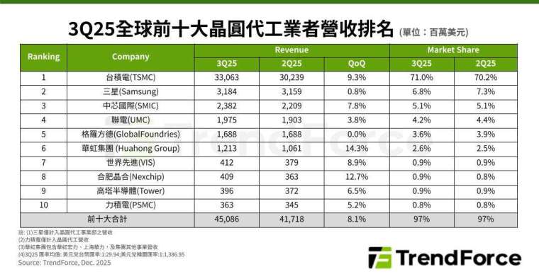 研調機構 TrendForce 最新調查,2025 年第三季全球晶圓代工產業持續受 AI 高效能運算 (HPC),和消費性電子新品主晶片與周邊 IC 需求帶動,以 7nm(含) 以下先進製程生產的高價晶圓貢獻營收最為顯著,加上中系廠得益於供應鏈分化商機,推升前十大晶圓代工廠第三季合計營收季增 8.1%,接近 451 億美元。