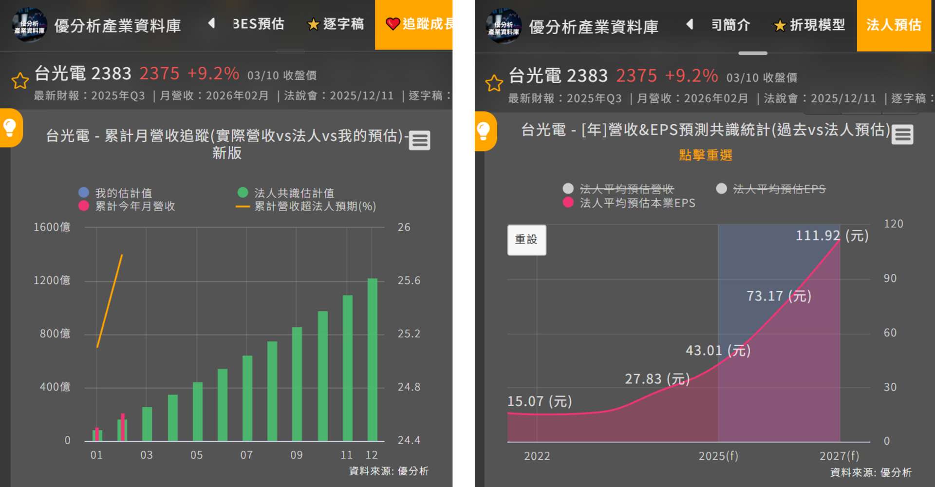 獲利與估值: 台光電(2383-TW)今年前兩月營收大幅超標,公司高層甚至對法人表示「訂單比想像中更好」,顯示即使不看 M9,現有接單也早已滿載。市場預估台光電今年 EPS 達 70-80 元,明年上看 90-100 元。若未來資金面回穩,在 AI 高成長的作夢行情下,給予 30 倍本益比,長線目標價確實有挑戰 3000 元的實力。短線若隨大盤回檔,可先以季線作為觀察支撐。