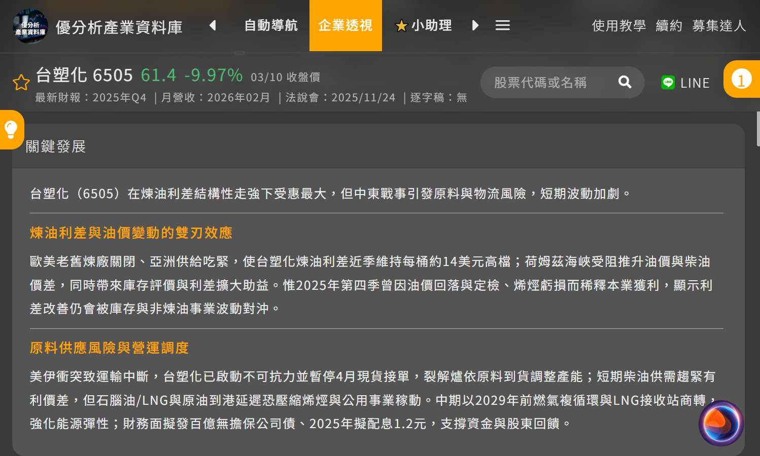 塑化類股(抗戰概念股): 以台塑化(6505-TW)為首的煉油廠會直接受惠於油價上漲;但中下游塑化廠雖短期有庫存平價利益,若終端需求不振將無法轉嫁成本。因此,塑化股僅建議作為「短線操作」標的。