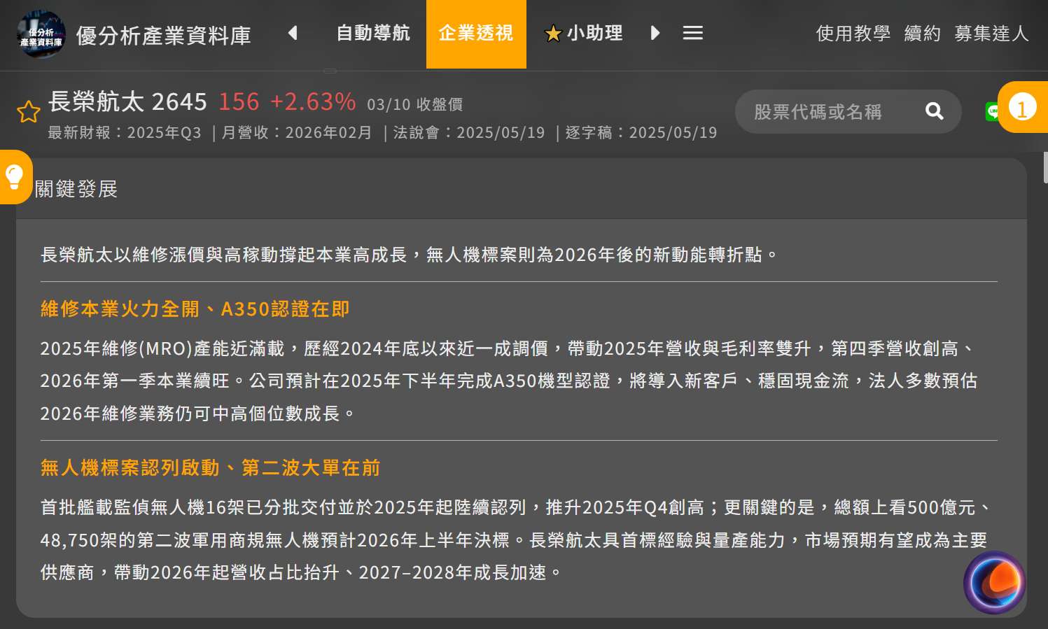 國防軍工概念股: 在全球地緣政治緊張及台灣軍購需求下,軍工股具備題材支撐,投顧相對看好業績與訂單能見度佳的長榮航太(2645-TW)。