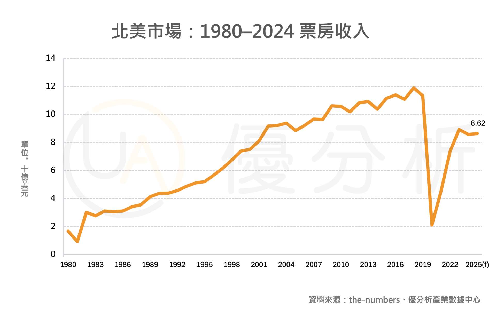 2025年12月21日(優分析/產業數據中心報導)⸺ 儘管壓軸大片《阿凡達:烈焰與灰燼》於聖誕節前上映,但整體而言,2025年對北美電影票房來說依舊是一個令人失望的年度。根據電影產業數據平台The Numbers的統計,今年北美總票房預估將與2024年相近,仍未能追上2023年的表現,更遑論接近疫情前的水準。