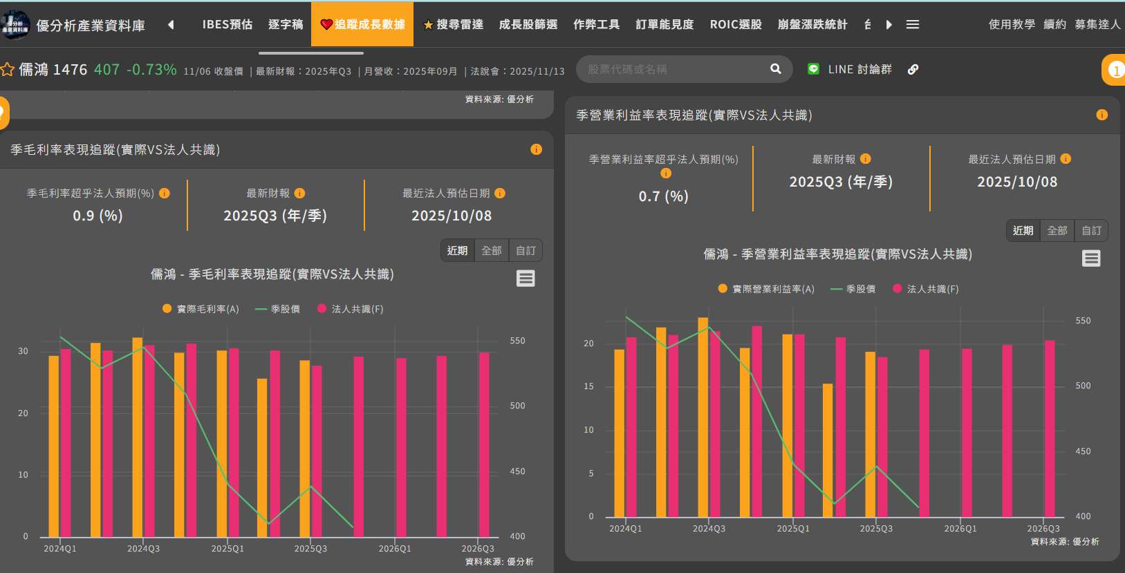 同一時間,同業儒鴻(1476-TW)昨日(11/06)甫公布2025年第三季毛利率亦回升至28%,較上一季的25.65%大幅回升,毛利率與營益率雙雙優於市場平均預期,再次驗證了關稅對獲利的影響逐漸淡化。公司表示,毛利率的回升主要受惠於美元走強、產品組合優化與新台幣匯率穩定。法人預期,若第四季北美與日本客戶補單動能延續,全年營收可望維持中個位數成長,淨利成長幅度有機會達雙位數。