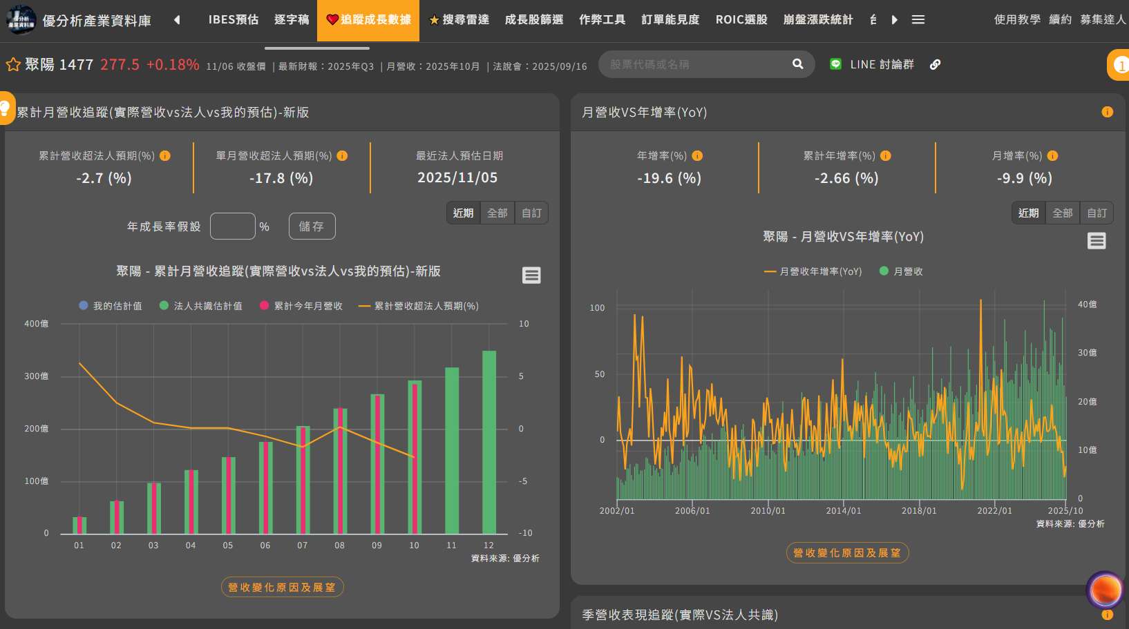 不過,即使公司的核心競爭力沒變,全球消費景氣的下滑以及關稅的紛擾,仍讓公司過去一年的營運量能下降,根據優分析統計的法人預測值系統,2025全年營收估衰退2.47%,核心盈餘衰退13.05%。