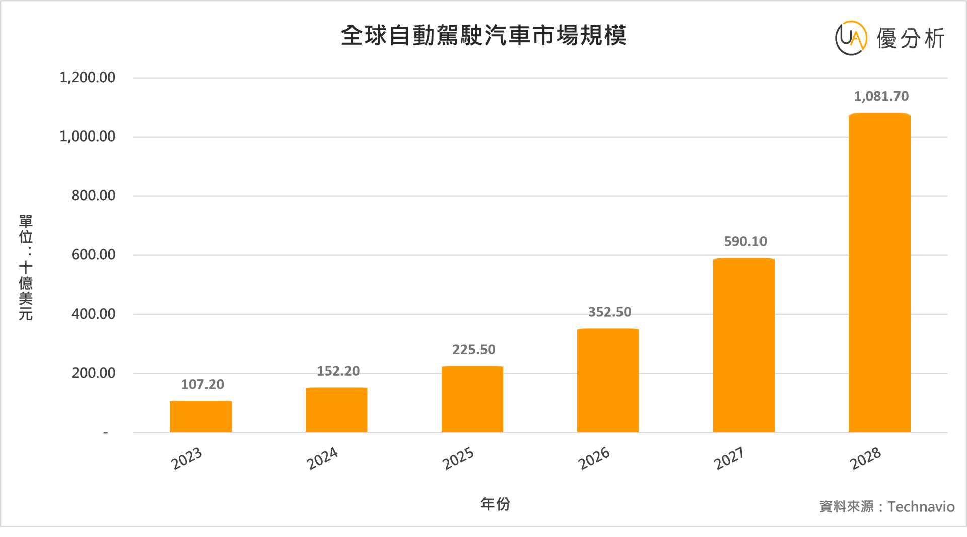 全球自動駕駛技術市場正在快速擴展,2023年估值為1,072億美元,預計到2028年將增長至10,817億美元。這期間將創造9,745億美元的增量增長機會,相當於2023年市場規模的910%,這代表了企業的重大增長機會。
