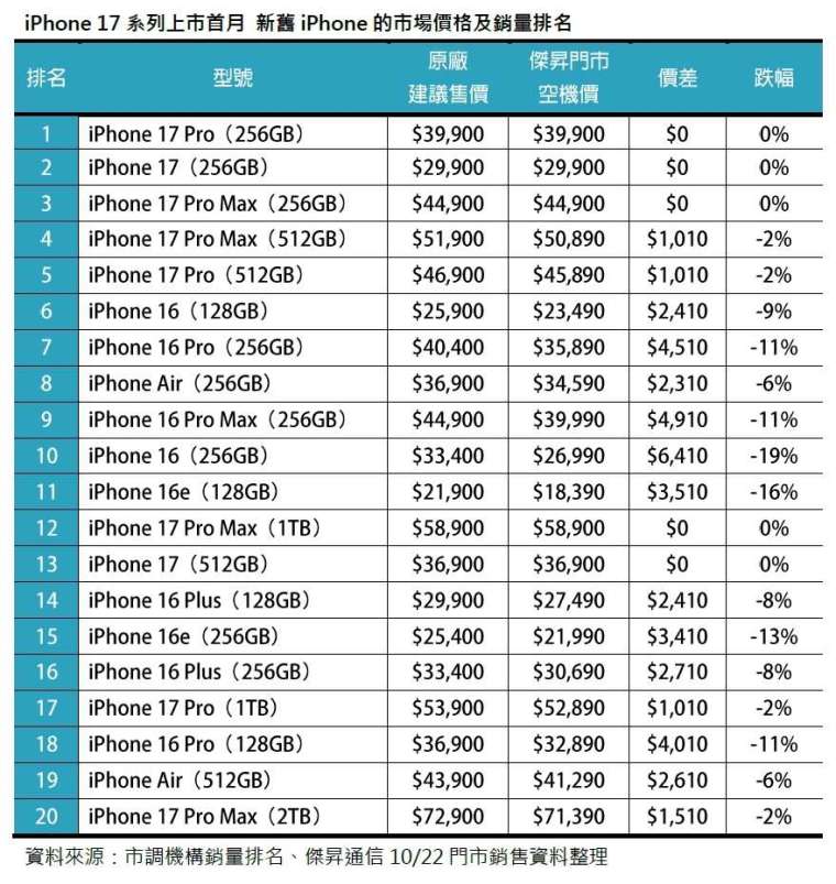進一步觀察新舊 iPhone 的價格資訊及銷量排名,市場一度傳出「定位尷尬論」的 iPhone 17 Pro(256GB)強勢奪冠。傑昇通信表示,Pro 系列一項是蘋果的銷售主力,但由於標準版 iPhone 17 的規格提升,以及全新超薄為主打的 iPhone Air 加入戰局,擔憂 iPhone 17 Pro 恐成為該系列最難賣機型。