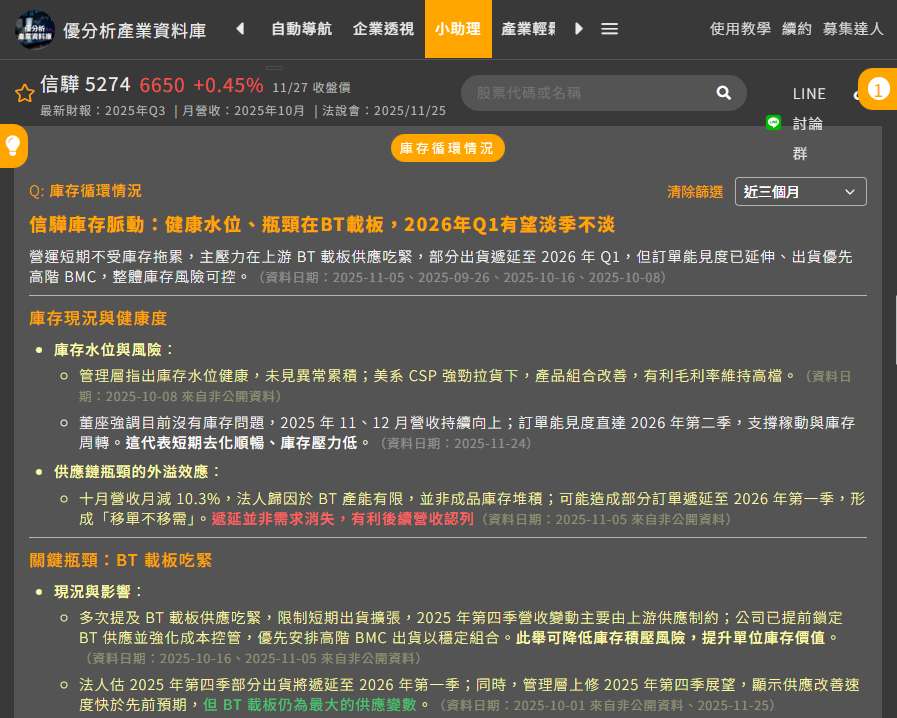 此外,信驊已提前預訂 2026 年上半年的 BT 載板產能,換句話說,公司已經把未來能做多少、能出多少的風險提前處理好,配合訂單能見度一路看到 2026 年第二季,信驊在產能規劃、備料與交期安排上,將更具競爭優勢。