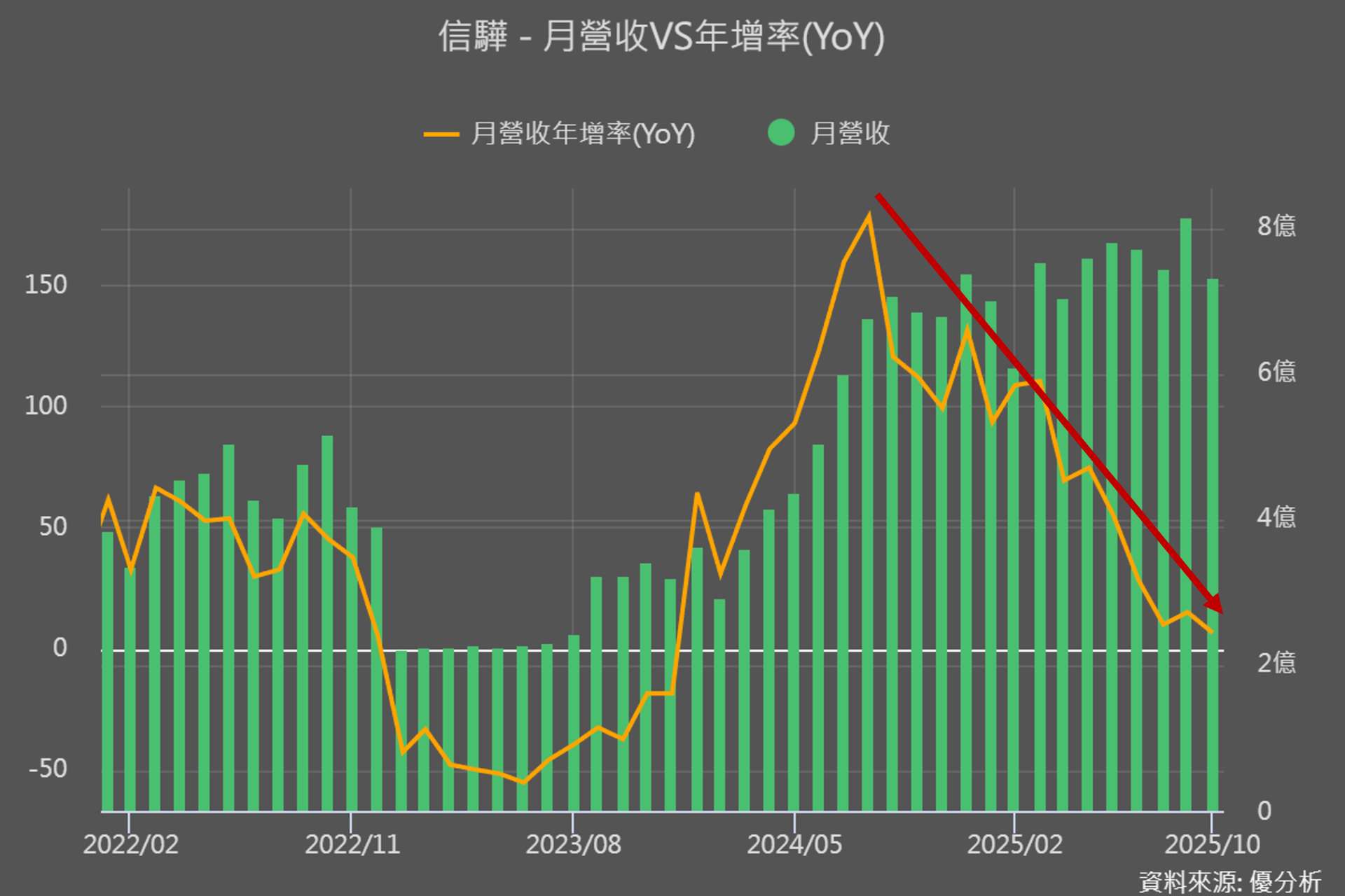 但如果我們把情緒放一邊、回到最基本的數字來看,會發現一件讓人困惑的事:信驊的月營收年增率 YoY 一路往下掉,發生了什麼?