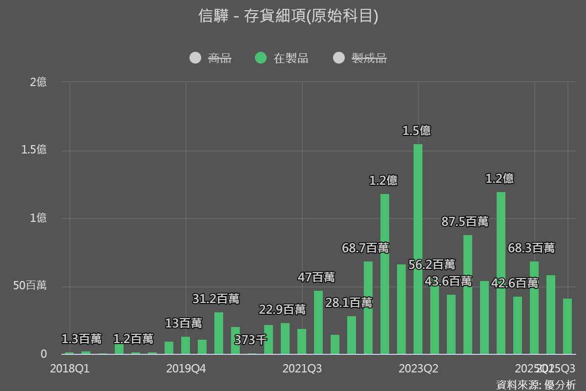 我們進一步觀察存貨細項,發現在製品不但沒有增加,反而一路往下掉,這種現象與前面推論的邏輯完全對不上。因為如果需求強,公司努力趕工,在製品理應同步拉升,但現在看到的結果是「在製品越來越少」,這表示公司根本沒有足夠的原物料讓產線維持滿載。