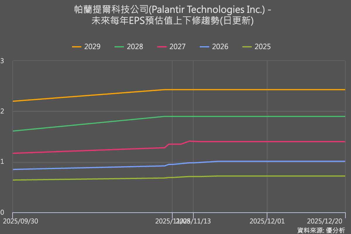 如封面圖表所示,Palantir訂單的明確度很高,因此市場最樂觀與最悲觀的預測差距相當小,但也因此使得盈餘缺乏更多的上修動能(見下圖),導致市場對於其極高的估值容忍度逐步下降。