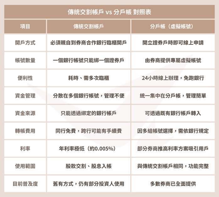 分戶帳優點當然是因為整體很方便,線上開戶一次搞定,免跑銀行,同時減少額外銀行帳戶,方便集中管理,支援電子支付帳戶,靈活度提升,降低違約交割風險,保障交易安全。而缺點則是,分戶帳無法直接提領現金,必須再轉回出款帳戶,跨行轉帳可能會產生費用,利率偏低,不適合放置大量資金。