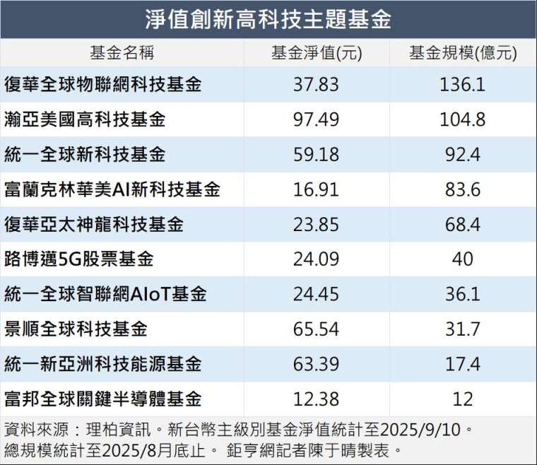 在甲骨文、輝達、博通等 AI 指標科技股接力領漲的帶動下,那斯達克指數幾乎日日創新高 (截至 2025/9/11);台股加權指數在大型電子權值股走強推升下,同步跟進創高,首度站上 2 萬 5 大關。全球科技主題基金受惠多頭氣盛,淨值同步登頂、牛氣沖天。