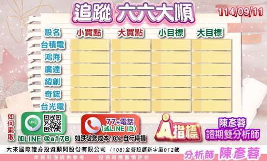 權值股方面,以下六檔股票,如果有把彥蓉的【66 大順】表格帶回去的朋友,全買在低點附近,台積電 (2330-TE) 漲 100 元,鴻海 (2317-TW) 漲 20 元,廣達 (2382-TW) 漲 20 元,緯創 (3231-TW) 漲 12%,恭喜。包括 台光電(2383-TW) 奇鋐(3017-TW),這六檔股票能不能再買,不用猜,現在股價如距離 表格中小目標還遠的可買,如距離小目標價接近了,要小心是否見高拉回?【66 大順】表格歡迎索取表格按表操課。