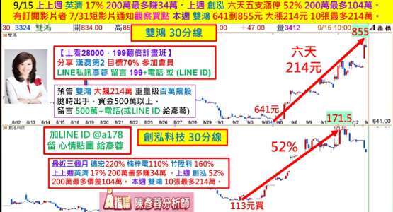 賀本欄預告的 竹陞科 (6739-TW) ,德宏(5475-TW),楠梓電(2316-TW),國精化(4722-TW),雷虎(8033-TW),攸泰(6928-TW),金居(8358-TW),南電(8046-TW) 全部兩個月翻倍 100%。本欄預告 台達電(2308-TW),五天大漲 126 元,雙鴻(3324-TW) 七天大漲 214 元! 想要領先於 每天早上九點前 得知當天誰有機會長紅漲停? 1-2 個月後資金翻倍 100%,歡迎點下面連接 加 LINE 留言 777+1 可領先得到提醒。