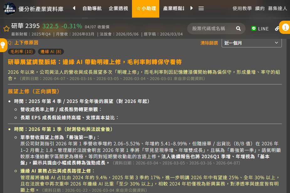 邊緣 AI 占比由 2024 年約 9.4% 提升至 2025 年約 20%,2026 年有機會達 30% 以上,毛利率約 42–43%,高於公司平均,成為未來成長與獲利的關鍵來源。