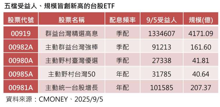 台股近日再創歷史新高,投資熱潮連帶使得台股 ETF 表現強強滾,根據 CMoney 統計資料顯示,75 檔主被動台股 ETF 規模與受益人中,共有 5 檔同創新高,其中僅 1 檔台灣精選高息 (00919-TW) 是被動式台股 ETF,其餘 4 檔皆為主動式 ETF。