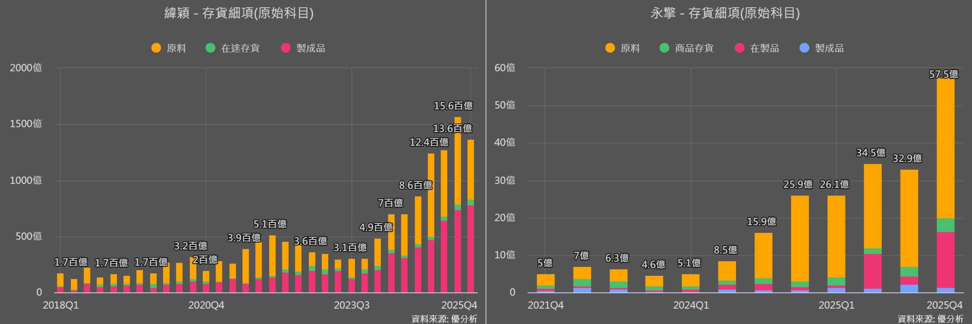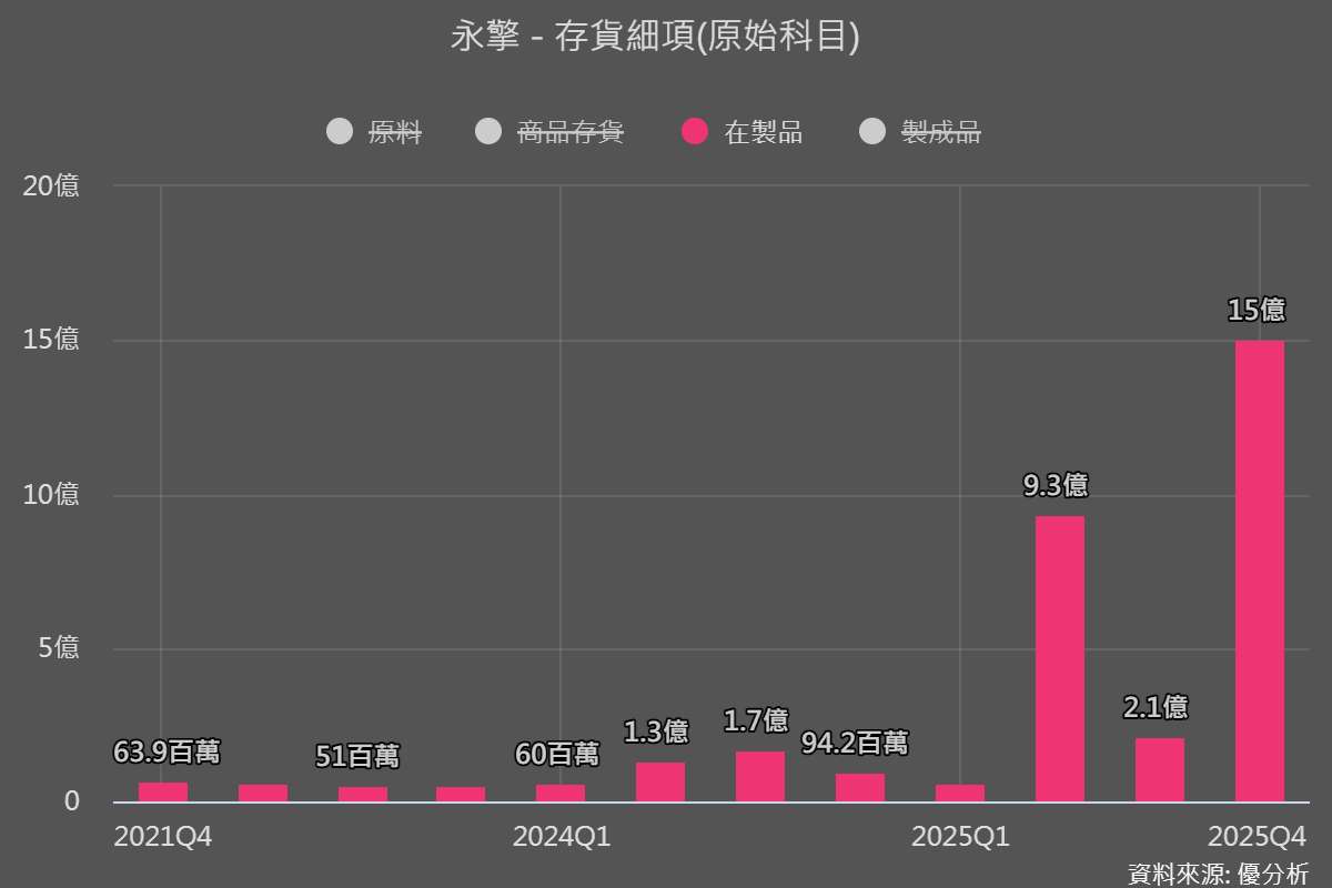 再進一步拆解永擎存貨結構可以看到,2025 年第四季在製品金額大幅拉升至約 15 億元,顯示訂單已進入實際生產與交付階段,代表後續營收與出貨動能仍具延續。