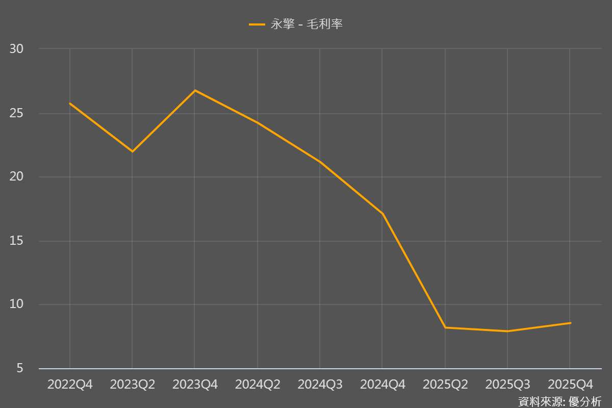 過去永擎毛利率受壓,主要就是因為 HGX 訓練型伺服器占比快速提升。這類產品雖然單價高,但 GPU 成本與整體 BOM 成本也高,導致毛利率相對偏低。2025 年第 3 季毛利率一度降至 7.9%。不過,隨著新訂單加價、附加價值提升,加上產品組合逐步調整,2025 年第 4 季毛利率已小幅回升至 8.54%。