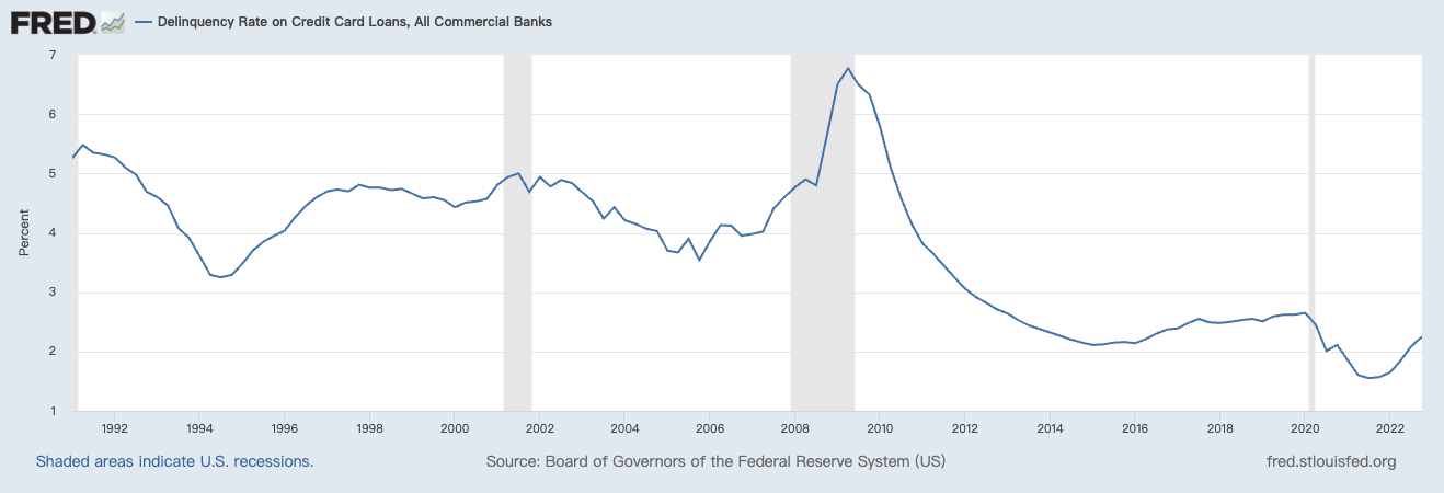 然而這次Q1卻不降反升,顯示消費者荷包真的很緊,而自從通膨出現以後,美國消費者的「貸款拖欠率」也是從底部開始攀升。