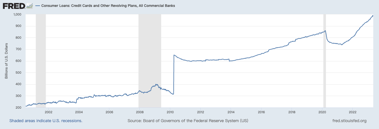 根據聯準會網站(FRED)最新公布的資料顯示,美國信用卡貸款(包含循環利息貸款),五月最新資料已經來到9855億美元,今年可能突破一兆美元。